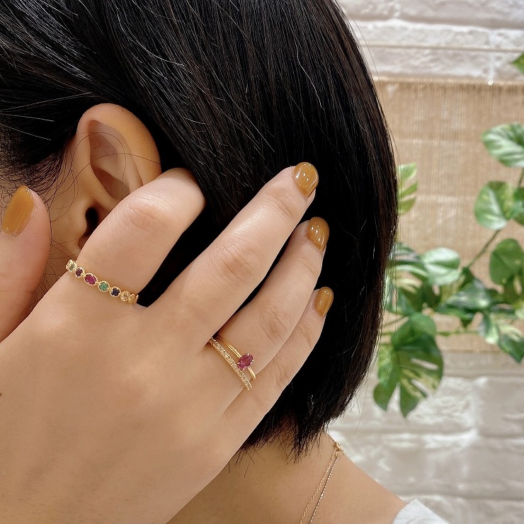 ルビーを筆頭に鮮やかな天然石リングでまとめたコーディネート。