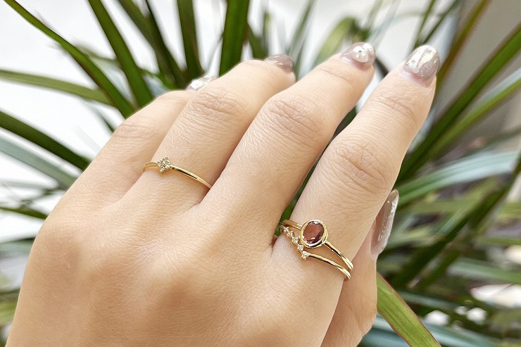 繊細に煌めくダイヤモンドの輝きに、ボリューム感のある天然石のリングを合わせた