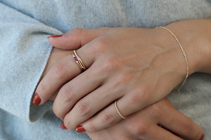 ゴールドリングとのレイヤードで一段と映える手元に。