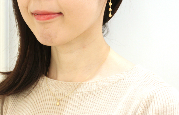 まるで星屑のような加工を施した18金のゴールドドロップのネックレスとお揃いのピアス。